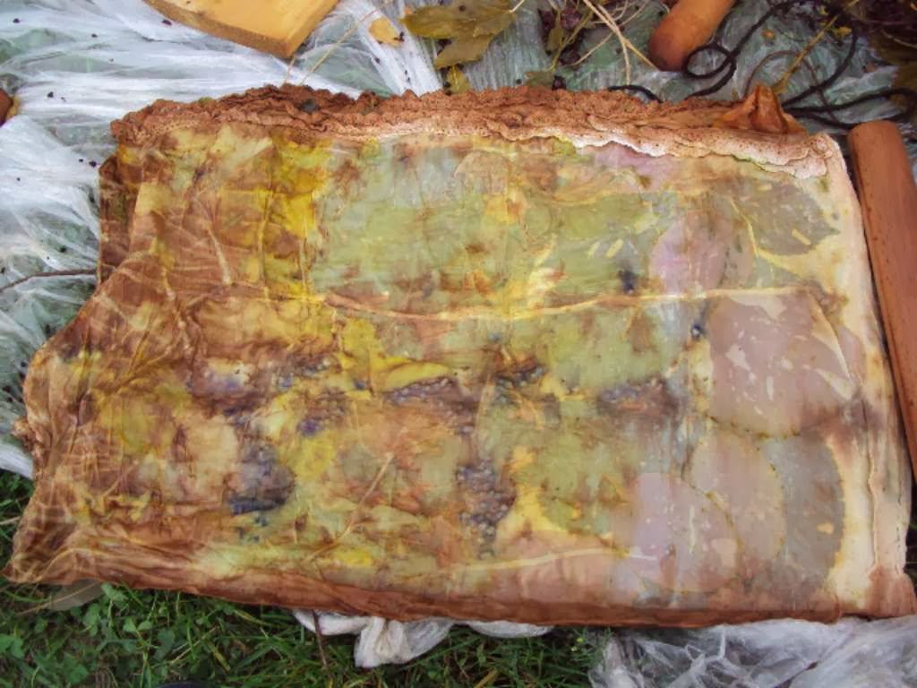 Sapete cos'è? è una evoluzione della Tintura Naturale, si utilizza per decorare i tessuti imprimendo direttamente il colore di foglie, cortecce, radici...è come se oltre al colore, estraessimo dalla pianta anche la sua impronta! Davvero bello!